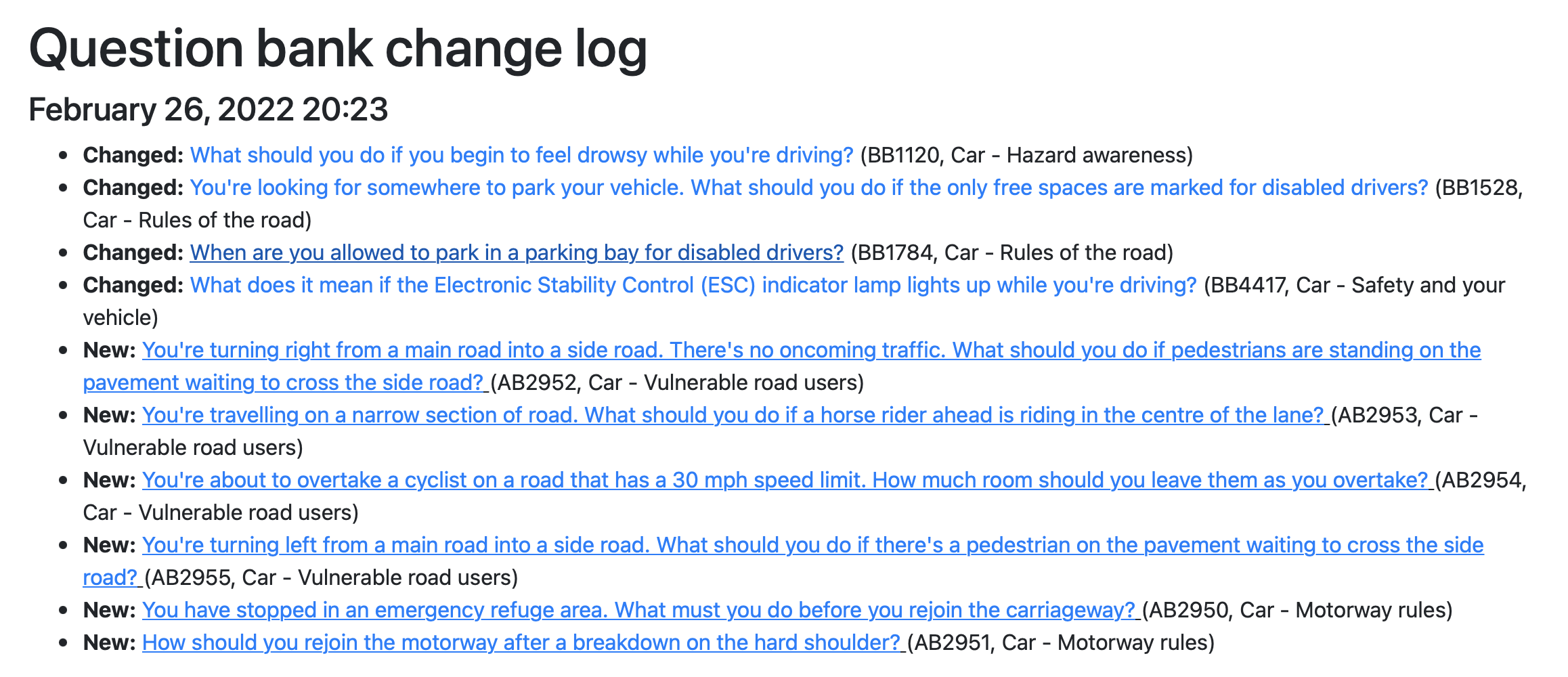 As well as updated or new practice questions appearing in our app, we also keep a regularly updated list of the changes on our website via our ‘Question bank change log’ webpage, which you can view here: