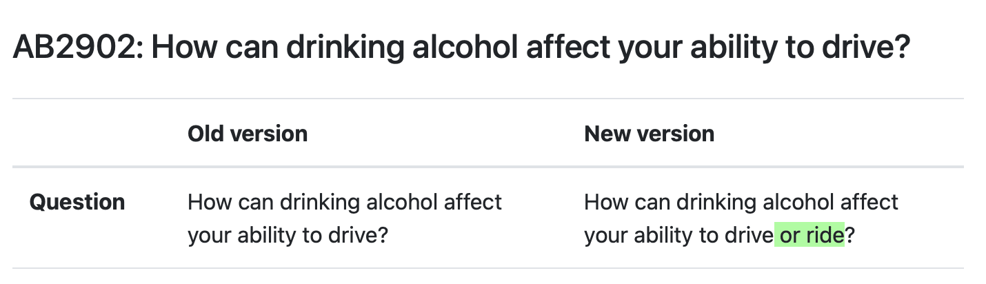 For existing questions that have been changed (or more likely simply tweaked), we list the old version and the new version side by side with any alterations highlighted so you can see what’s new at a glance: